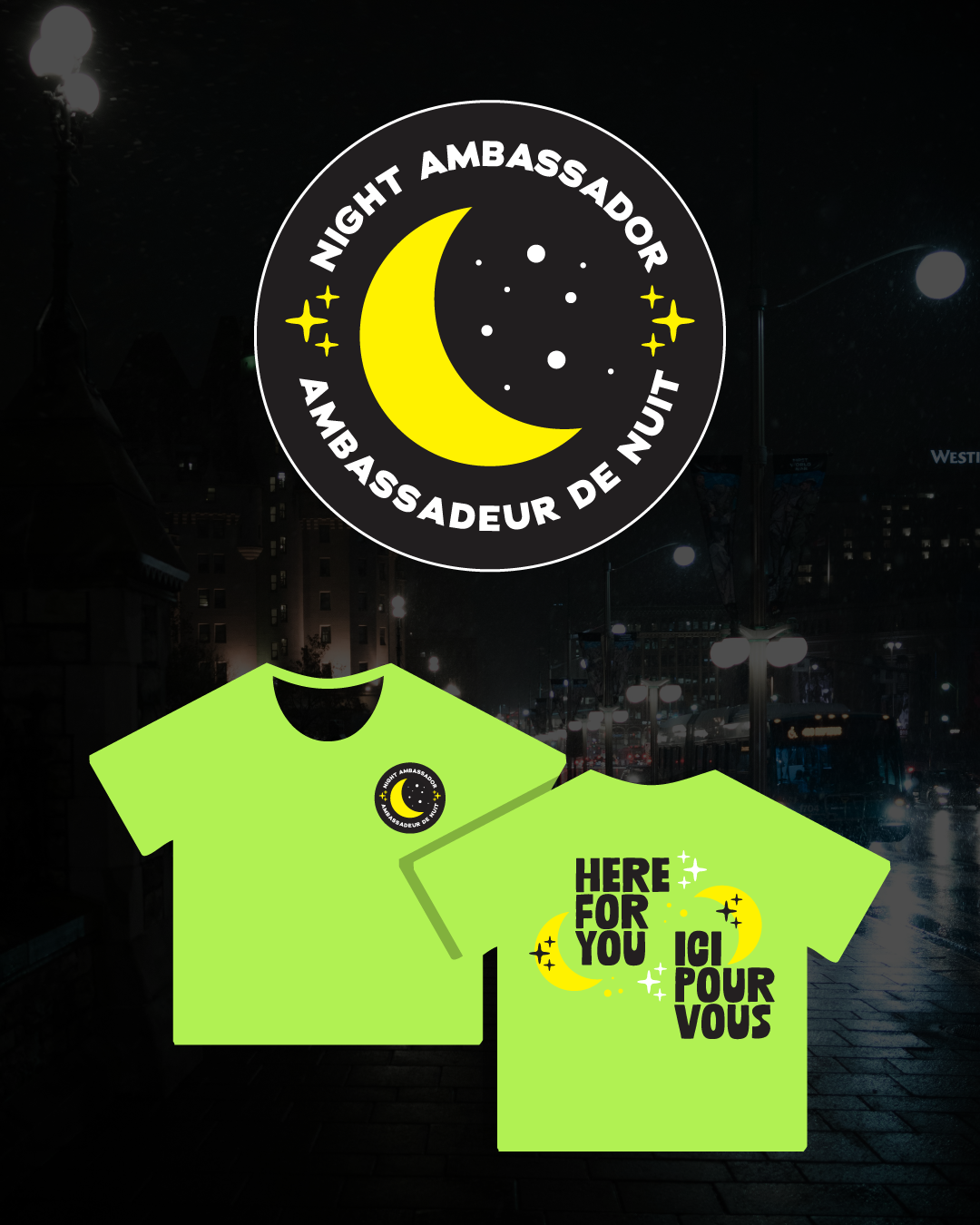 Que vous ayez besoin d'indications, d'une bouteille d'eau ou d'un soutien immédiat, les ambassadeurs de nuit seront présents, accessibles et prêts à vous aider.